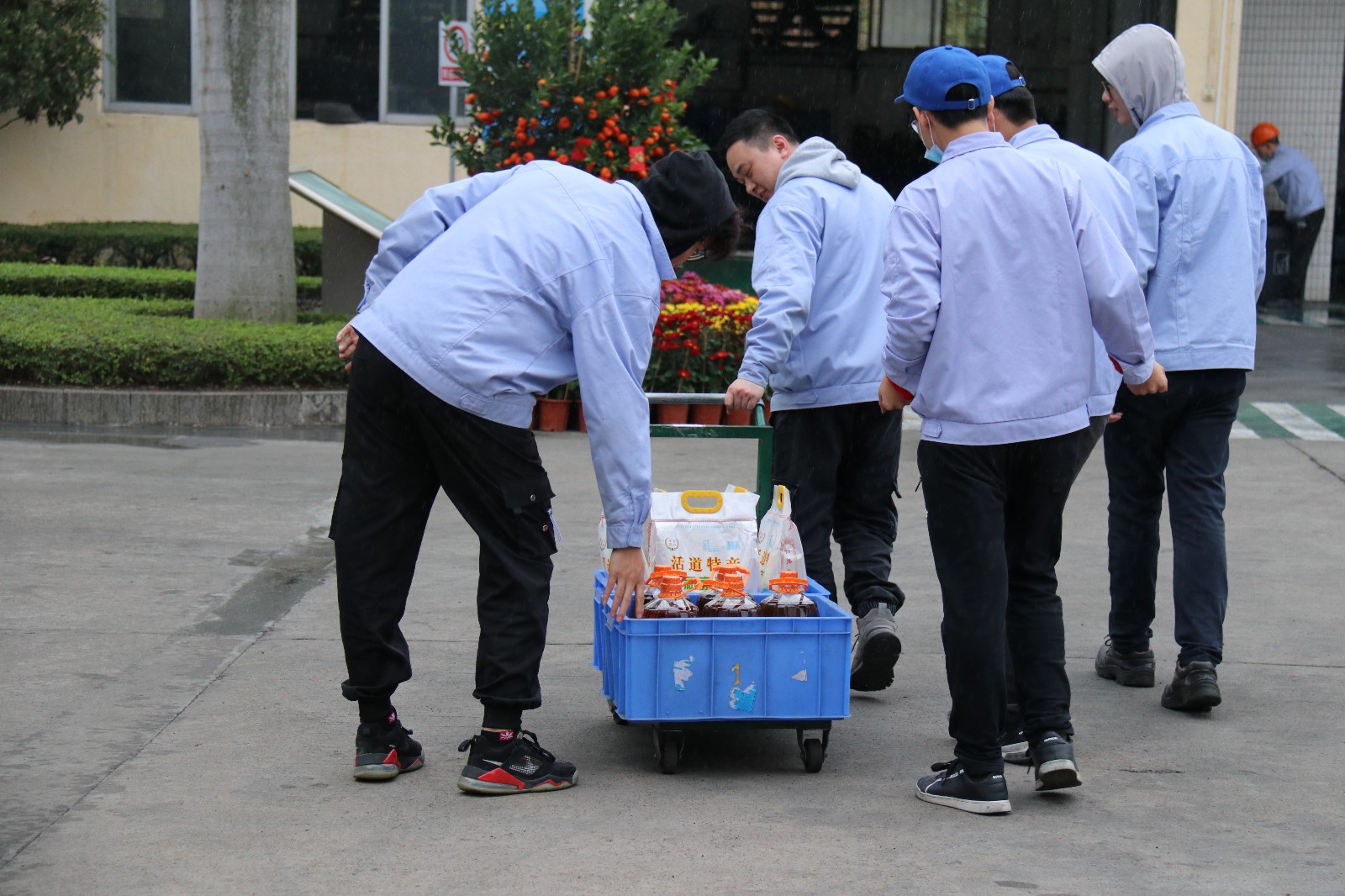 雖然今天天公不作美,但一張張燦爛而開心的笑臉卻將發(fā)放現(xiàn)場(chǎng)氣氛點(diǎn)燃,員工一陣陣開心的笑聲伴隨著隨處可見你來我往、手捧肩扛的情景。特別是各部門人員配合默契,維護(hù)秩序、搬運(yùn)、核對(duì),各司其責(zé),將承載著公司關(guān)懷的春節(jié)福利傳遞到每一位力源人手中。這些東西捧在手里,暖在心里。